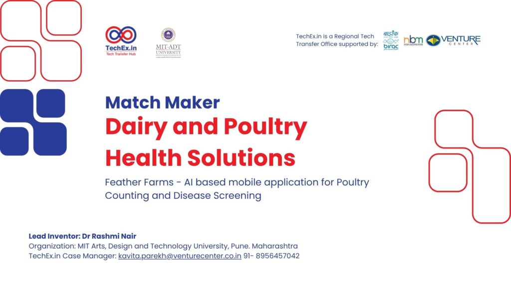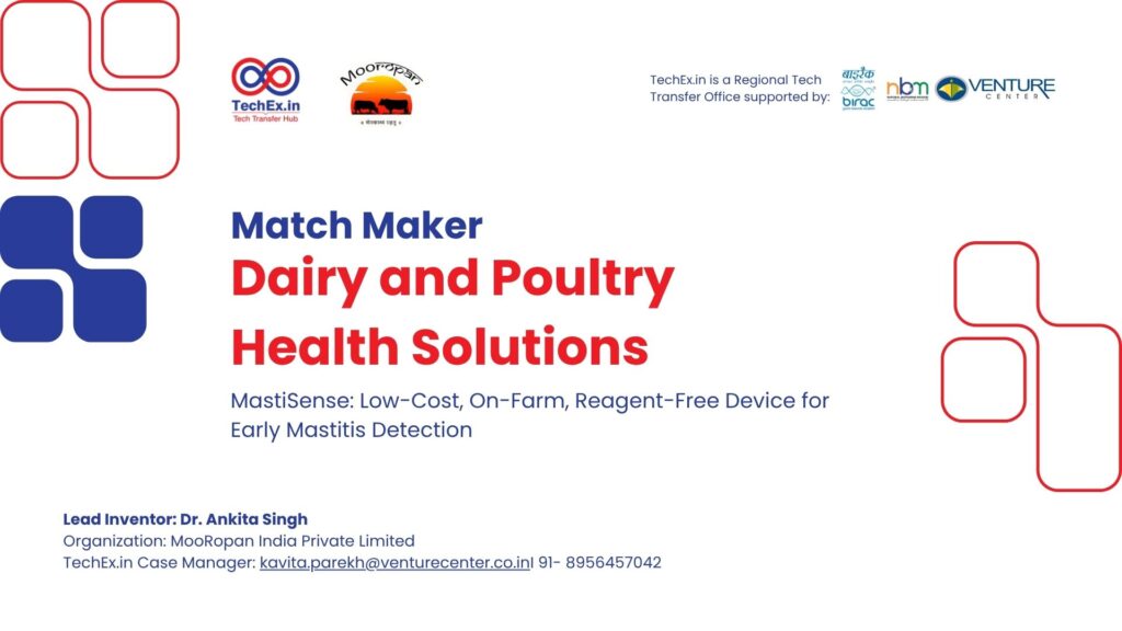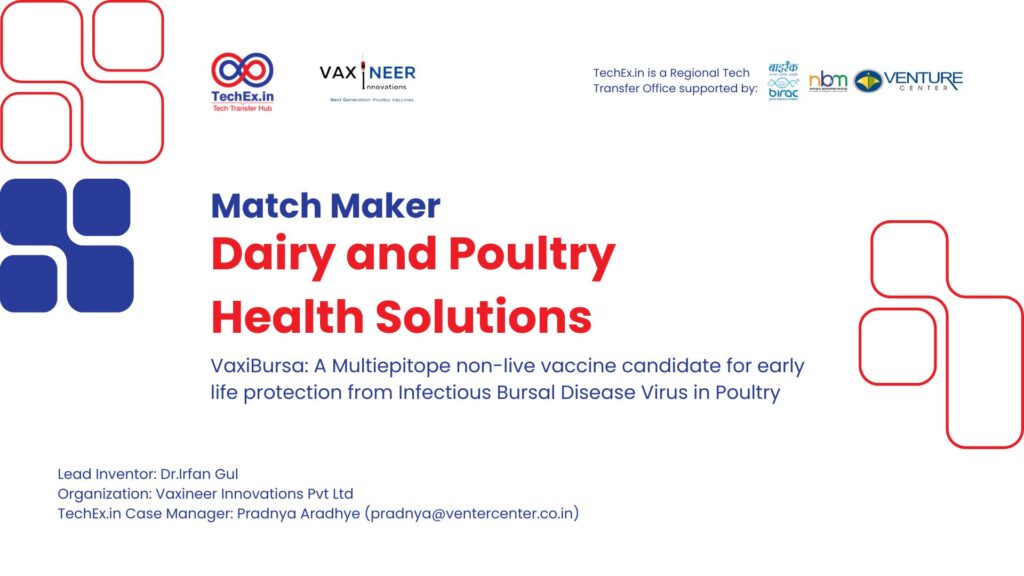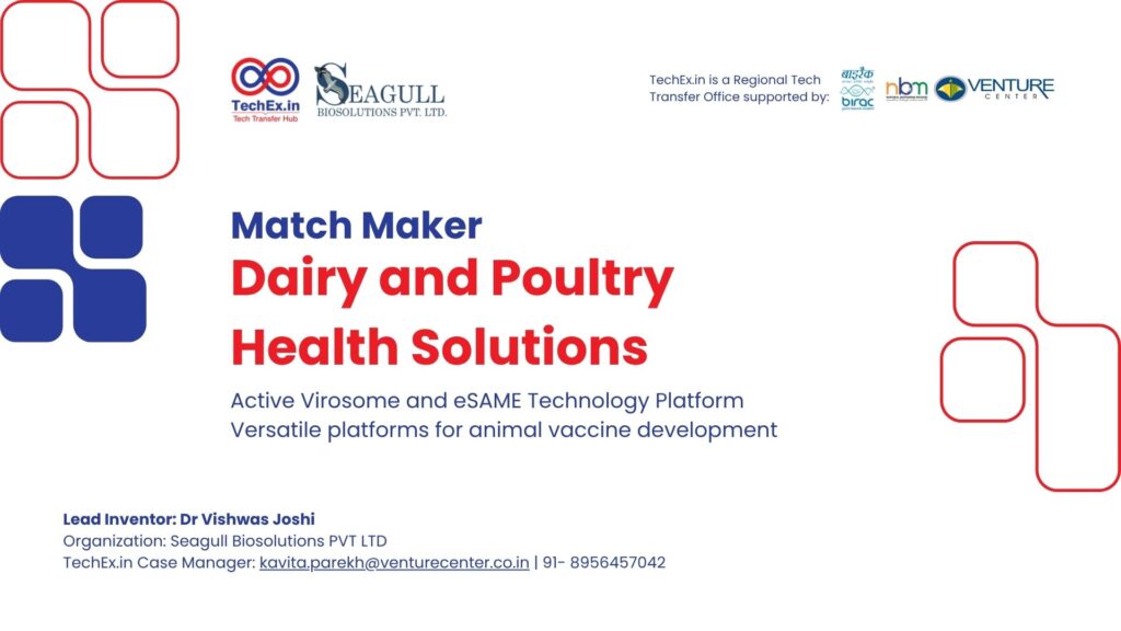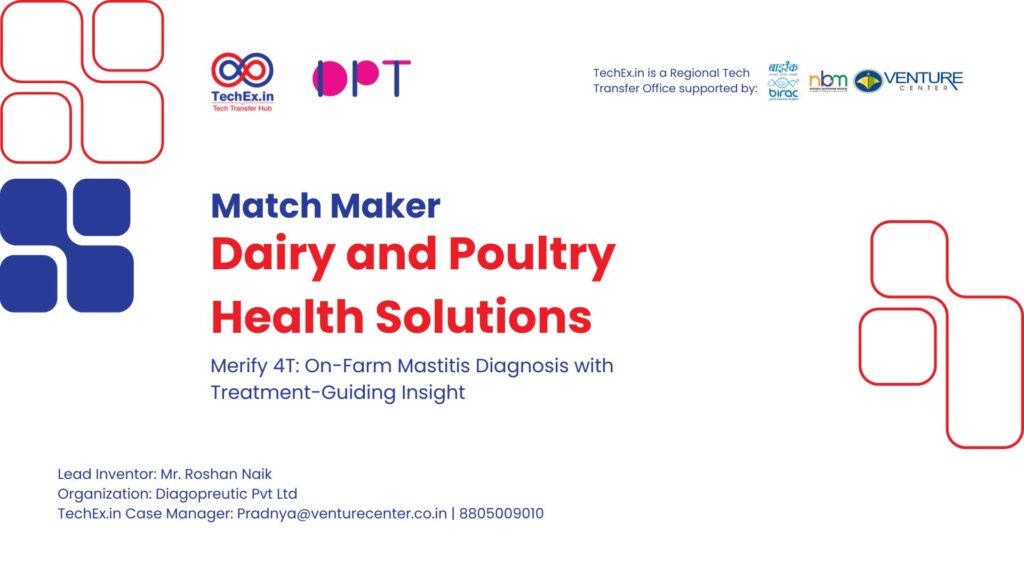 Click Here to Express Interest in a Technology Product:MplasGuard Dr. Asmita Prabhune : Green Pyramid Biotech Pvt Ltd Technology Pitch Video (Youtube) Technology Pitch Presentation Product:MastiSense Dr. Ankita Singh: MooRopan India Private Limited Technology Pitch Video (Youtube) Technology Pitch Presentation Product:VaxiBursa Dr.Irfan Gul: Vaxineer Innovations Pvt Ltd Technology Pitch Video (Youtube) Technology Pitch Presentation Product:Merify 4T: Mr. Roshan Naik: Diagopreutic Pvt Ltd Technology Pitch Video (Youtube) Technology Pitch Presentation Product:Feather Farms Dr Rashmi Nair MIT Arts, Design and Technology University, Pune. Maharashtra Technology Pitch Video (Youtube) Technology Pitch Presentation Product:Vaccinne Development Platform Dr Vishwas Joshi Seagull Biosolutions PVT LTD Technology Pitch Video (Youtube) Technology Pitch Presentation